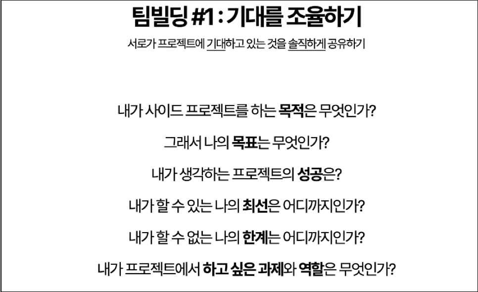 서로가 프로젝트에 기대하고 있는 것을 솔직하게 공유하라는 조언을 들었다.