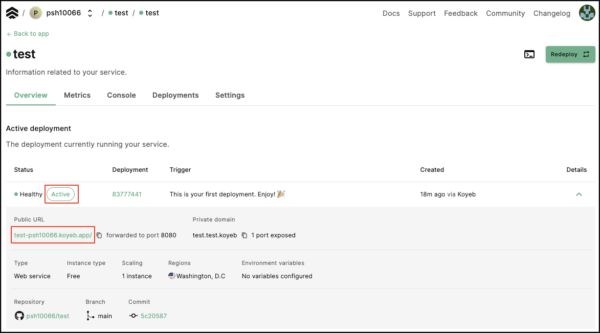 아래와 같이 Active 표시가 활성화된 경우 배포가 정상적으로 완료되었음을 나타낸다.